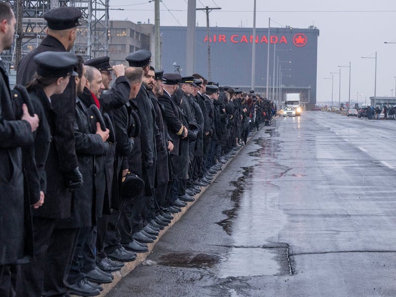 Hundreds of pilots and flight lined the road outside Air Canada headquarters in Montreal on Thursday awaiting the repatriation of the remains of Air Canada Jazz pilot Antoine Forest. Captain Forest, aged 30, and First Officer Mackenzie Gunther, 24, both died when their plane collided with an emergency vehicle at New York's LaGuardia Airport last Sunday.